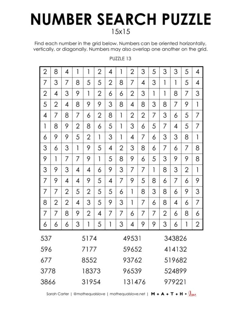 Number Search Puzzles 15×15 Math Love
