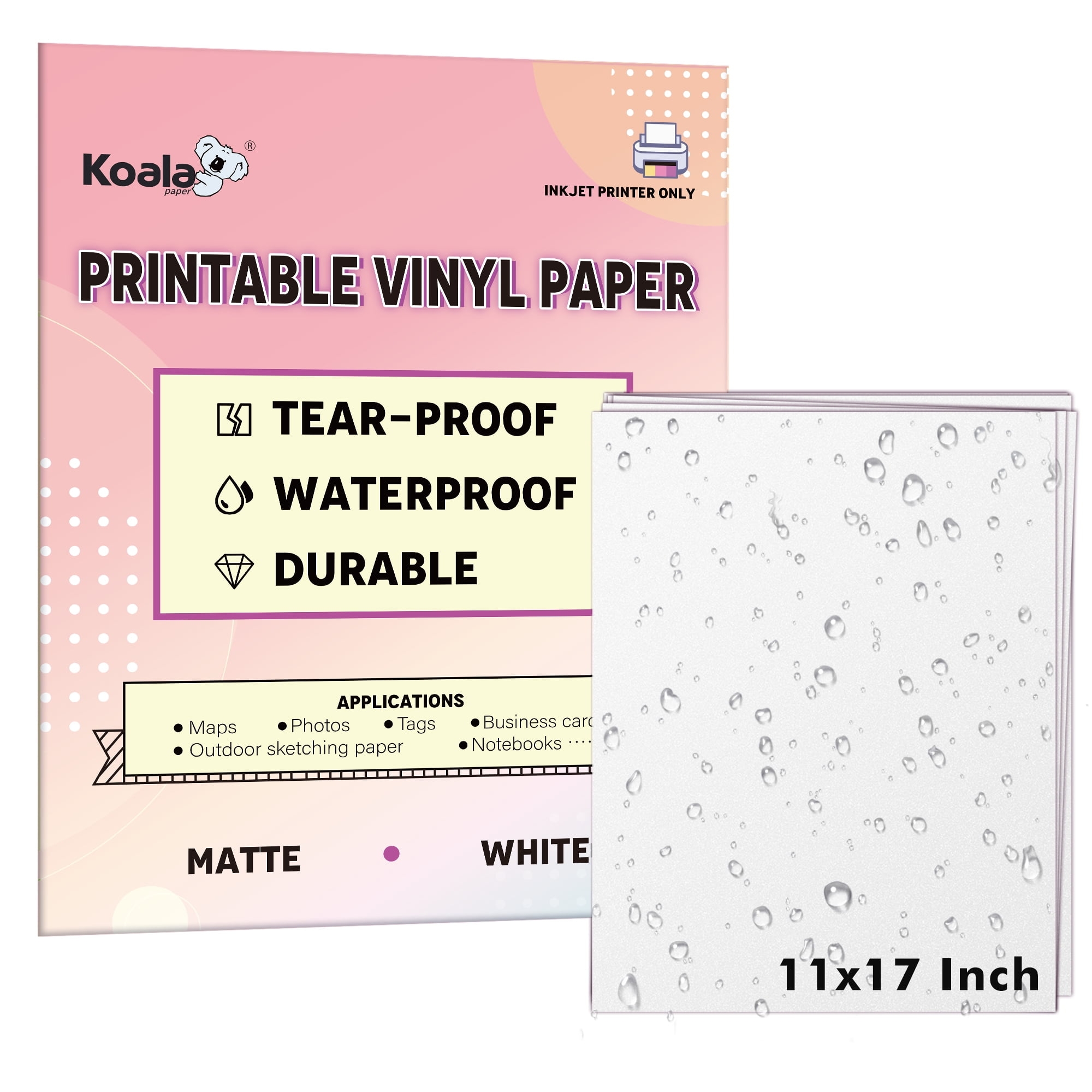 Bulk Koala Inkjet Waterproof Paper 11×17 150 Sheets Matte White Printable Vinyl Printer Synthetic Paper Quick Drying Non Tearable Multipurpose Paper Walmart